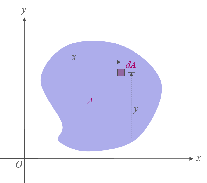아래 그림과 같은 임의의 형태를 갖는 단면에서, 단면의 아주 작은 부분 \(dA\)의 \(x, \, y\)축에 대한 단면 2차모멘트 \(dI_x ,\, dI_y\)는 각각 단면적 \(dA\)와 수직거리 \(x, \, y\)의 제곱의 곱, 즉 \(dI_x = y^2\,dA , \, dI_y = x^2\,dA\)이다.