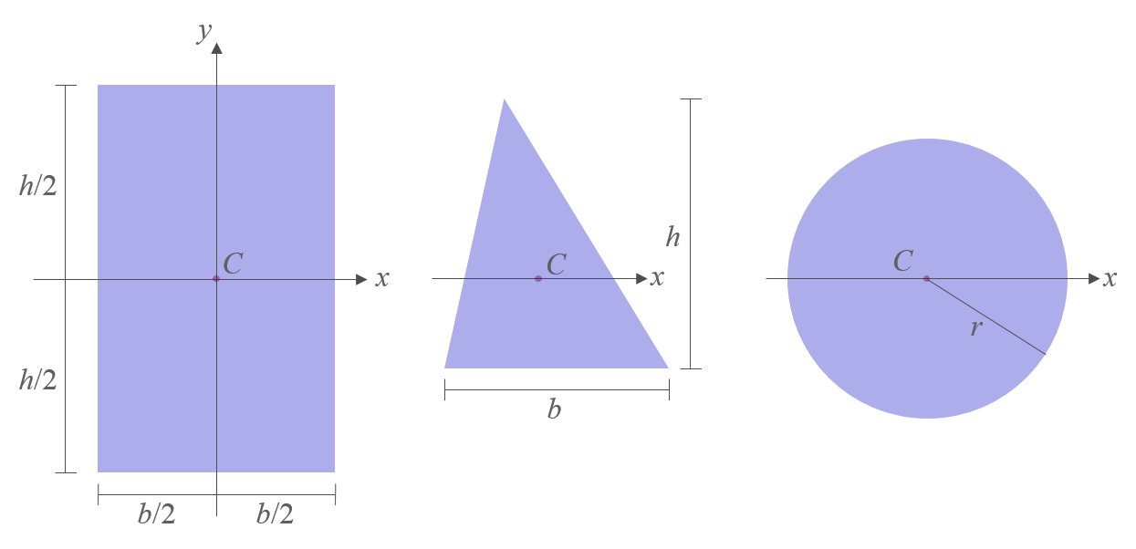 아래 그림에서, 직사각형, 삼각형, 원형 단면의 경우, 위의 적분식에 따라 도심을 지나는 \(x, \, y\)축에 대한 단면 2차모멘트를 계산하면 각각 다음과 같다.